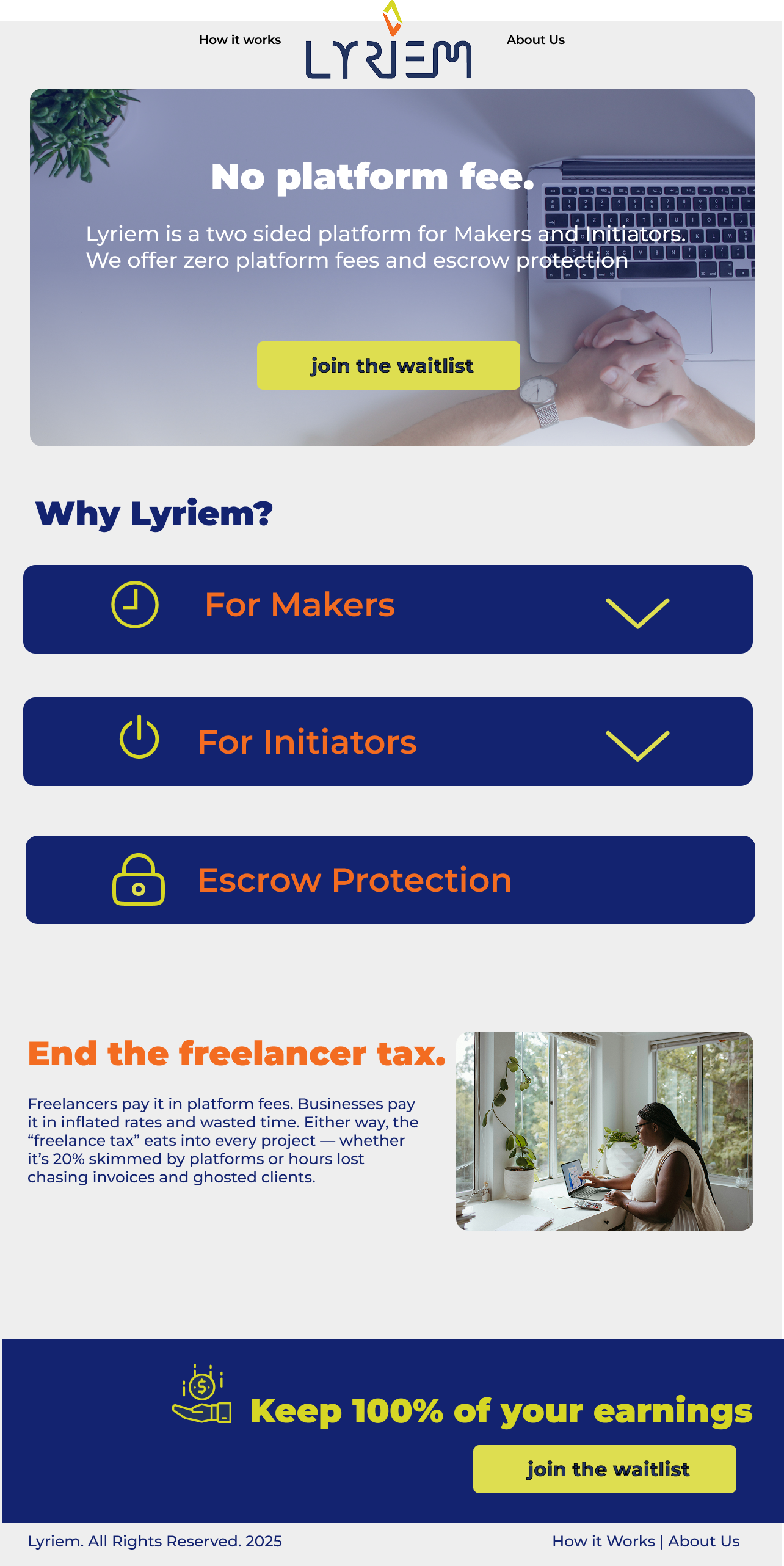Lyriem is a next-generation freelancer marketplace built around transparency, trust, and autonomy. Designed for both Makers (freelancers) and Initiators (clients), it replaces platform fees and hidden costs with blockchain-secured contracts and escrow protection—empowering users to work directly, without intermediaries taking a cut.